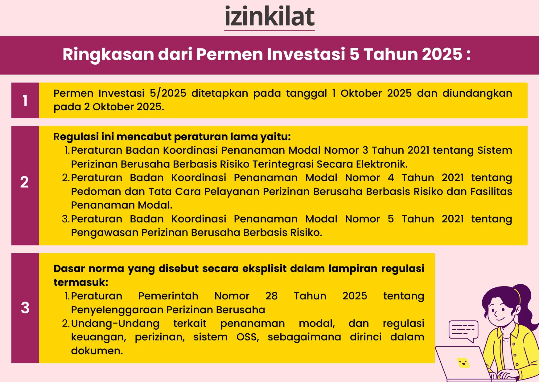 Permen Investasi dan Hilirisasi / Kepala BKPM Nomor 5 Tahun 2025 (selanjutnya Permen Investasi 5/2025) mengatur pedoman teknis pelaksanaan perizinan berusaha berbasis risiko dan fasilitas penanaman modal melalui sistem OSS (Online Single Submission).
