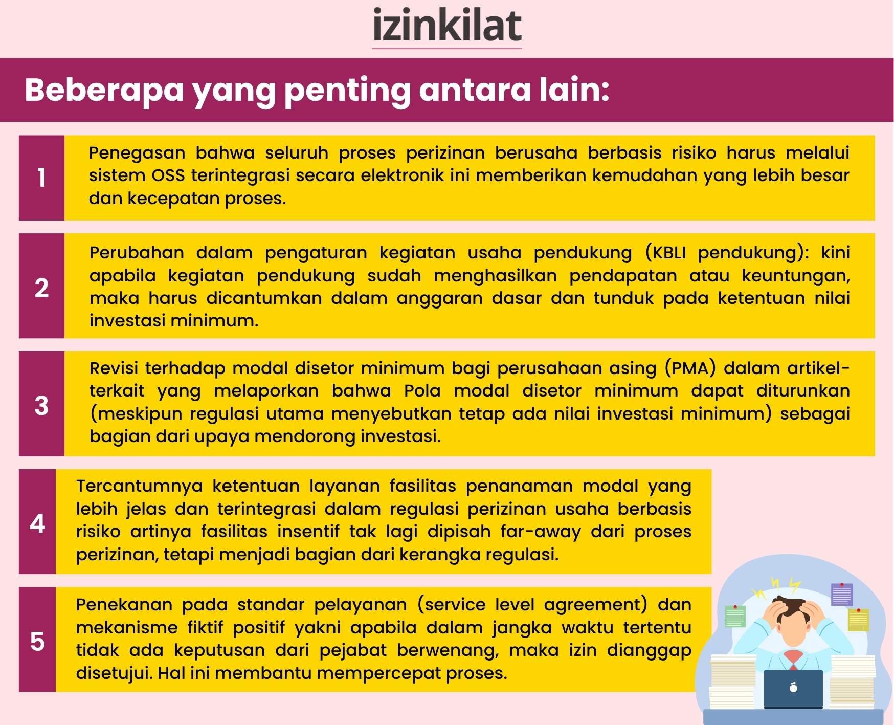 - Mengatur tata cara, persyaratan dasar, pelaksanaan hingga pengawasan perizinan usaha berbasis risiko dalam sistem OSS.