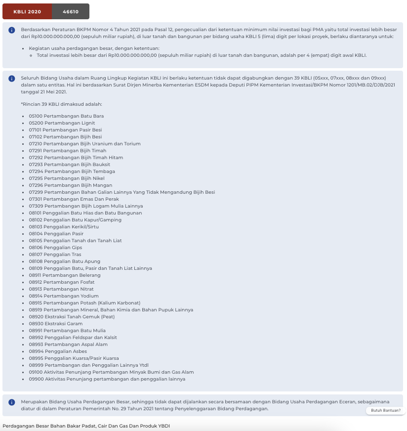 KBLI 46610 tidak bisa digabung dengan KBLI pertambangan lain seperti 05100, 05200, atau 07101.
