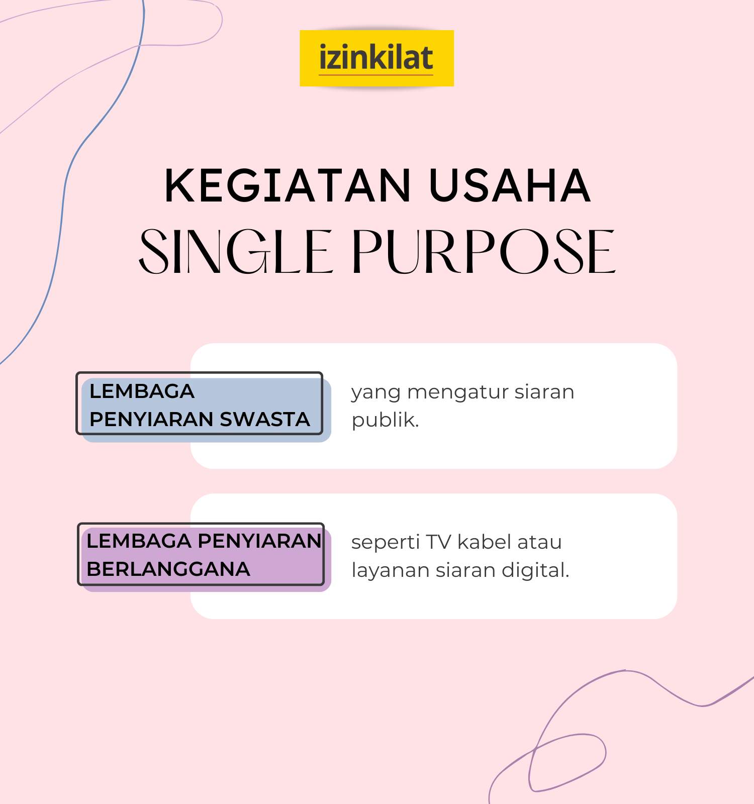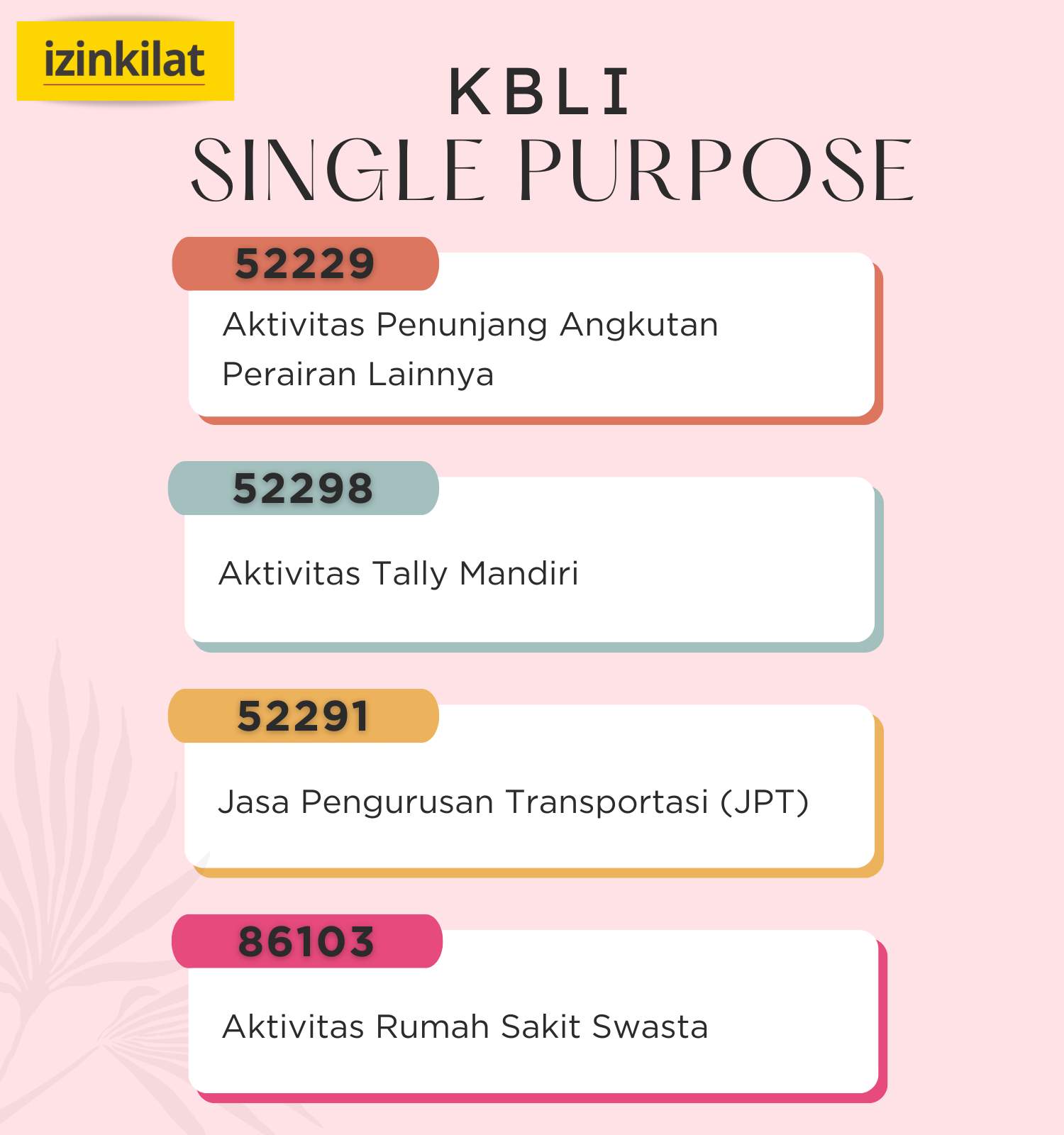 - KBLI Single Purpose adalah kode bidang usaha yang tidak boleh digabung dengan KBLI lain dalam satu perusahaan.