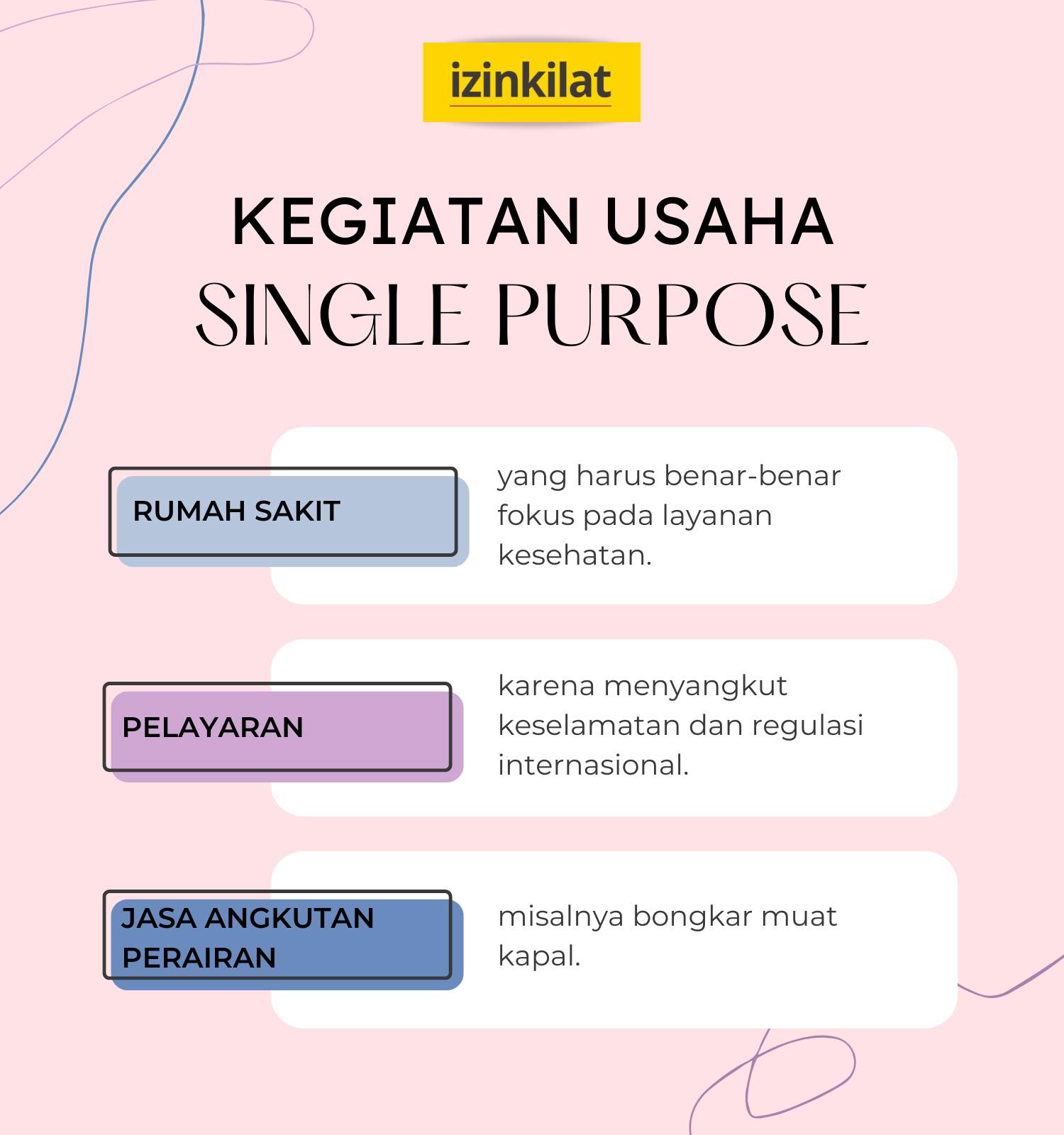 Single Purpose berarti ada jenis usaha tertentu yang hanya boleh berdiri untuk satu tujuan khusus dan tidak bisa digabungkan dengan kegiatan usaha lain. Aturan ini dibuat agar badan usaha yang bergerak di bidang tersebut bisa lebih fokus, terkontrol, dan sesuai dengan standar yang ditetapkan pemerintah.