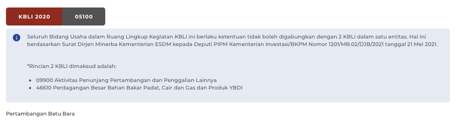 - KBLI 05100 tidak bisa digabung dengan KBLI pertambangan lain seperti 09900 dan 46610.